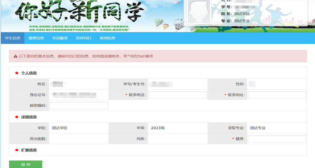 第二步:进入系统后,点击“学生信息”核对本人信息是否一致,按要求填写相关资料,点击“保存”。